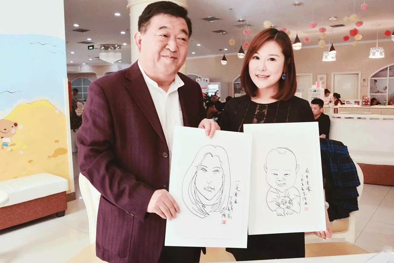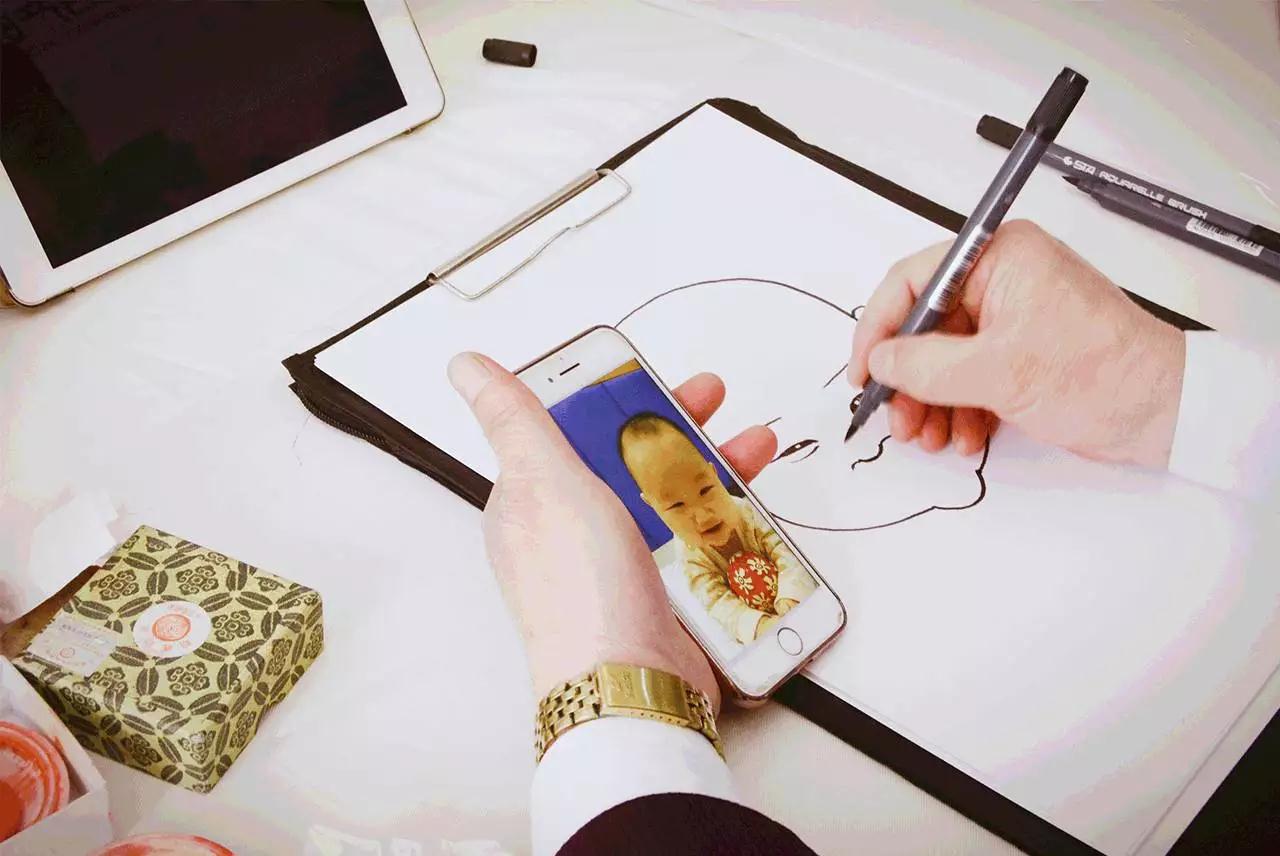 在另个区域,卡通肖像画家正在作画,小溪把小雨果的生活照展示给画家,也来给宝宝定制幅手绘肖像画~