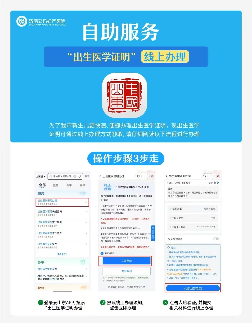 为更好地服务广大群众,方便新生儿能够快速、便捷的办理出生医学证明,济南艾玛妇产医院线上办理出生医学证明服务已开启,艾玛宝爸宝妈通过线上即可办理领取,办理操作步骤如下,有需要的宝爸宝妈看过来: